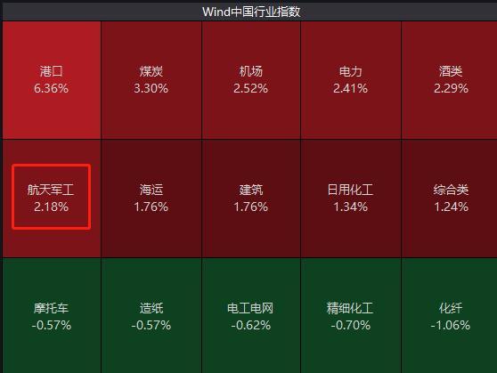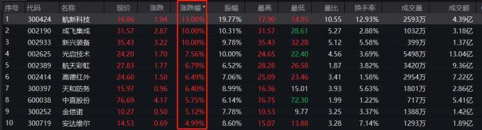 个股看,航新科技(300424.SZ)涨13%,成飞集成(002190.SZ)、新兴装备(002933.SZ)涨停,光启技术(002625.SZ)、航天彩虹(002389.SZ)、高德红外(002414.SZ)、天和防务(300397.SZ)涨超6%。