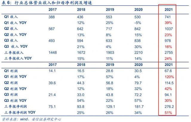业绩由稳增长向高增长转变。近两年军工同比业绩维持较高增速,2021前三季度实现营业收入(2755亿,+24.2%);实现归母净利(276亿,+ 51% ),A股行业排名9/29。