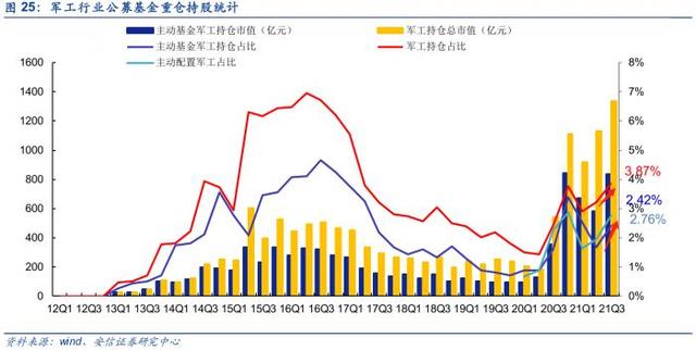 机构持仓:军工持仓市值及占比创历史新高,主动配配置持续向上。公募基金三季度军工板块持仓市值创历史新高,加仓市值最多的个股是:振华科技、紫光国微、中航机电、鸿远电子、抚顺特钢。