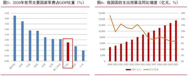 需求研判:中国占军费占GDP比重提升空间较大,“十四五”需求次第展开。当前,我国国防实力与经济实力不匹配,军费占GDP比重长期保持在2%以下,2020年为1.75%,与其他世界军事强国俄罗斯(4.26%)、美国(3.74%)、印度(2.88%)等仍有较大差距,比重仍有较大的提升空间。