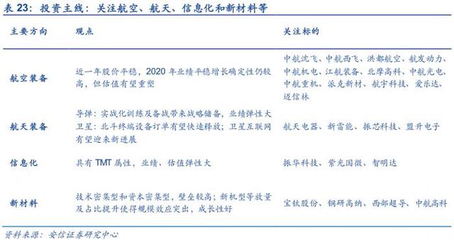安信证券:建议关注航空、航天、信息化和新材料四条主线,选择报表端可不断反映自身增长的同时还可印证行业景气度,且估值与业绩增长相匹配的优质标的。