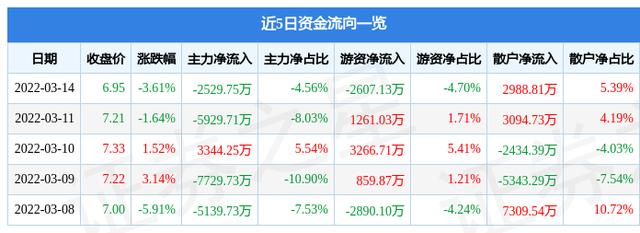 资金流向数据方面,上个交易日主力资金净流出2529.75万元,游资资金净流出2607.13万元,散户资金净流入2988.81万元。近5日资金流向一览见下表: