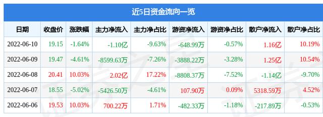 资金流向数据方面,6月10日主力资金净流出1.1亿元,游资资金净流出648.99万元,散户资金净流入1.16亿元。