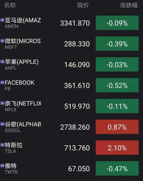 美国大型科技股周一多数下跌,特斯拉涨逾2%。