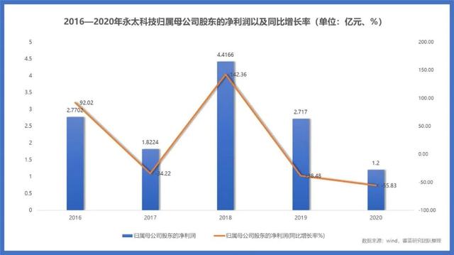 2016年至2020年,永太科技归母净利润分别2.77亿元、1.82亿元、4.42亿元、2.72亿元、1.20亿元,同比增长率分别92.02%、-34.22%、142.36%、-38.48%、-55.83%。