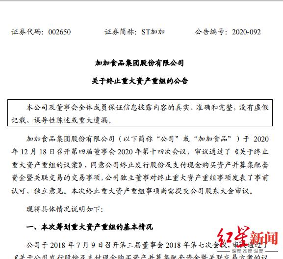 12月20日晚,加加食品(ST加加,002650)发布关于终止重大资产重组的公告称,终止收购大连远洋渔业金枪鱼钓有限公司(以下简称“金枪鱼钓”)100% 股权。