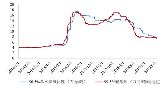 从锂价格来看,基于上述,在产量供给方面不断扩大的同时,下游需求疲软,导致行业供需关系格局转变,我国锂化工产品的平均价格近来出现明显回调,据亚洲金属网,碳酸锂(含税)自2018年3月约15.4万元/吨下降至7.4万元/吨-8万元/吨的区间;氢氧化锂(含税)自13.万元/吨下降至约7.7万元/吨-9万元/吨的区间