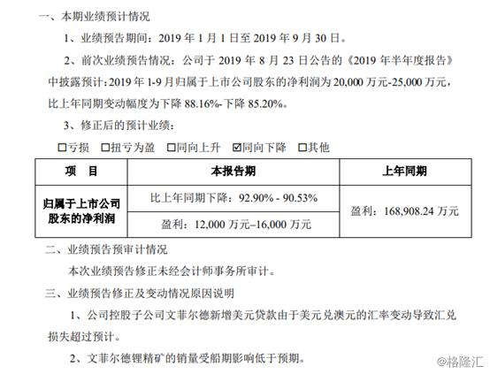 本文摘要:10月14日,天齐锂业(002466.SZ)发布业绩修正公告显示,下修业绩预期,预计前三季度盈利修正为1.2亿元-1.6亿元,比上年同期下降92.9%-90.53%,前次业绩预告为预盈利2亿元-2.5亿元。修正的主要原因为控股子公司文菲尔德… …