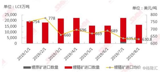 从进口数据来看,据SMM,8月国内锂精矿进口量为12.3万吨LCE,环比降21.5%,同比升5.6%;无锂原矿进口。价格方面继续下跌,8月锂精矿进口均价为630美元/吨,环比跌0.8%,同比跌21.2%。其中,用于生产锂盐的锂精矿为11.9万吨LCE,均价616.1美元/吨。