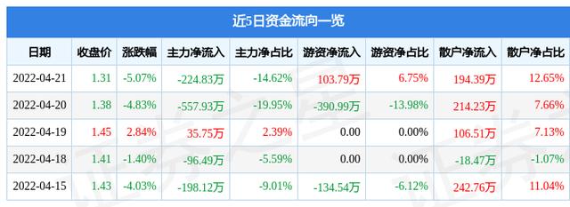 资金流向数据方面,上个交易日主力资金净流出224.83万元,游资资金净流入103.79万元,散户资金净流入194.39万元。近5日资金流向一览见下表: