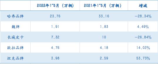不过,从累计销量来看,1~5月长城汽车销量约为41.73万辆,相较于去年同期(约51.75万辆)同比下滑19.36%,相差近10万辆。其中,哈弗品牌和皮卡成为长城汽车旗下销量下滑幅度较大的两大板块。