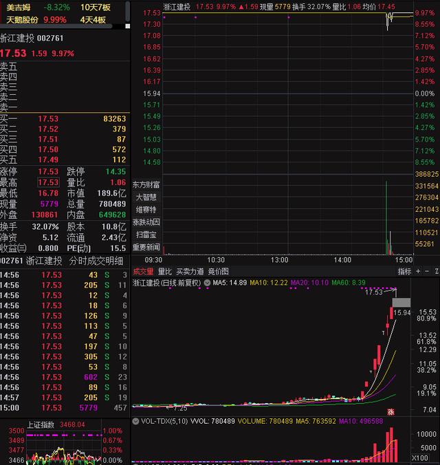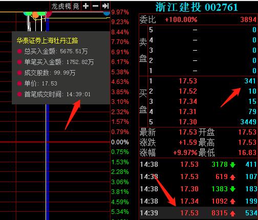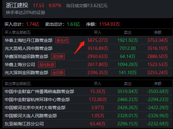 其次,看好大基建方向的浙江建投,今天出手4次,共买入3.23万手,均价17.53,合计5675万。