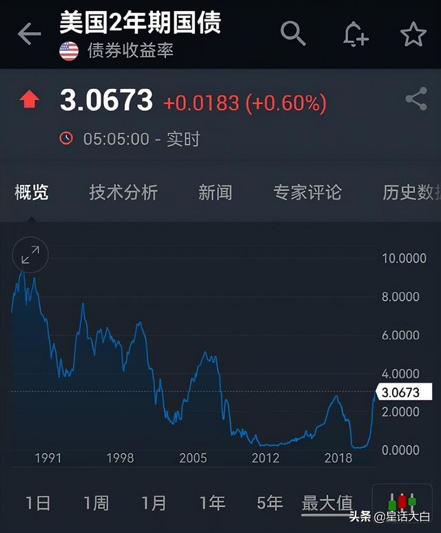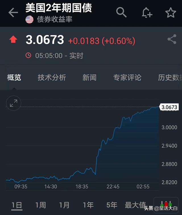 昨晚,美国2年期国债是大涨8%,一口气涨到3.07%。