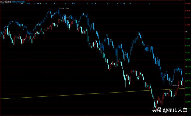 我把纳斯达克指数跟创业板指数叠加在一起,图里的虚K线是纳斯达克指数,实体K线是创业板指数。