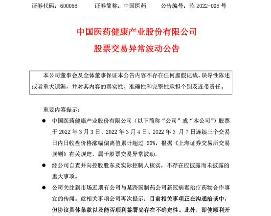 3月7日晚间,中国医药公告表示,公司股票已经连续三个交易日内日收盘价格涨幅偏离值累计超过20%,根据《上海证券交易所交易规则》有关规定,属于股票交易异常波动。
