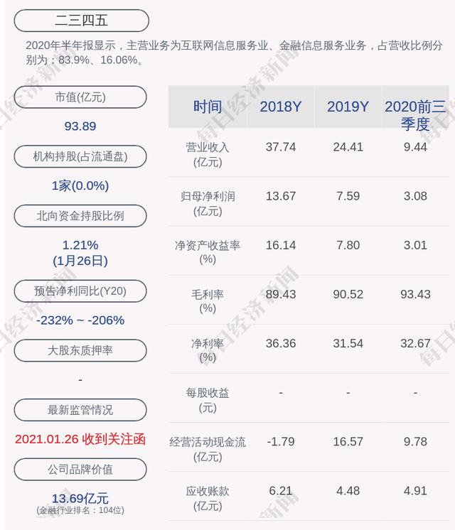 本文摘要:每经AI快讯,二三四五(SZ 002195,收盘价:1.64元)1月27日晚间发布公告称,上海二三四五网络控股集团股份有限公司股票于2021年1月25日、1月26日、1月27日连续三个交易日内日收盘价格跌幅偏离值累计超过20%。经核查,公司… …