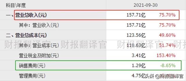 2021年第三季度,该企业的营业收入同比增长了75%,而对应的销售费用却降低了9%。