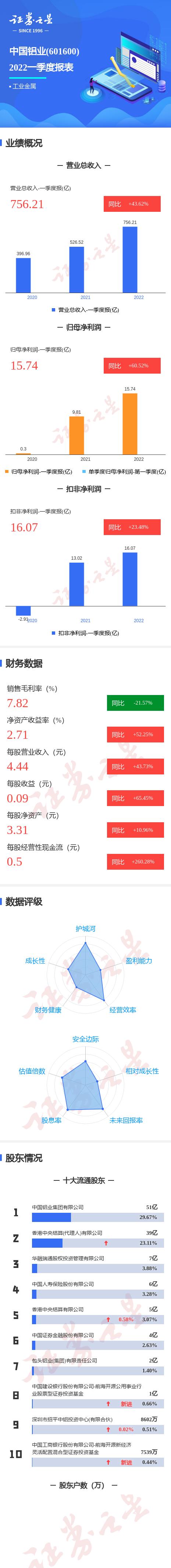 本文摘要:中国铝业2022一季报显示,公司主营收入756.21亿元,同比上升43.62%;归母净利润15.75亿元,同比上升60.52%;扣非净利润16.08亿元,同比上升23.48%;其中2022年第一季度,公司单季度主营收入756.21亿元,同比… …