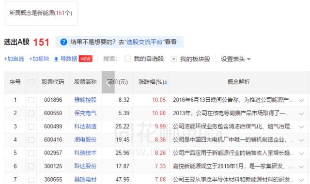 3)最后就是输入关键字了,比如说想查找【新能源概念】,就能从中选出这些有新能源相关资讯的公司,其中【概念解析】一栏里面会有这些信息的重点内容