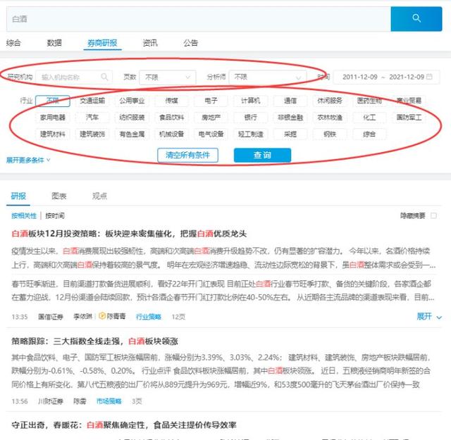比如输入关键字——白酒,就能出来白酒相关报告,输入股票就能出现股票相关研究报告。