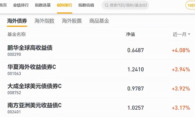 3)【QDII排行】中也是可以按照净值和时间查找,和【业绩排行】一栏差不多,主要分四个板块【海外债券】、【海外指数】、【海外股票】、【商品基金】