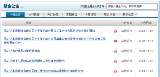 5)在【基金公告】中可以查看基金所有的公告内容,比如基金的业绩报告、分红送配、管理人变更等等