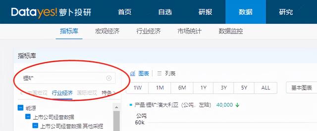 6)除了研报方面,还可以查询【数据】,在指标库的红圈内,输入你想查询的行业,比如今年新能源行业很火爆,想查一下它的上游相关资源锂矿