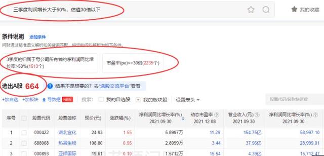 1)输入筛选条件,随意选两个指标,比如今年股票三季度利润增长大于50%,再加上估值低于30倍的股票。