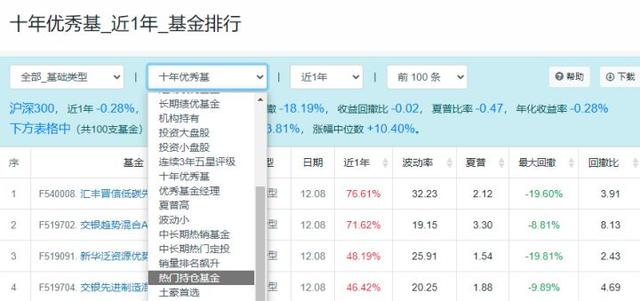 7)最后,还可以设定不同的条件,从基础类型中选择货币、混合、股票等类型,然后在选择比如【十年优秀基】或者【长期绩优基金】等等,条件有很多,再根据时间范围,就可以查找出自己感兴趣的范围,也可以下载成表格,然后导出成文件夹,十分方便。