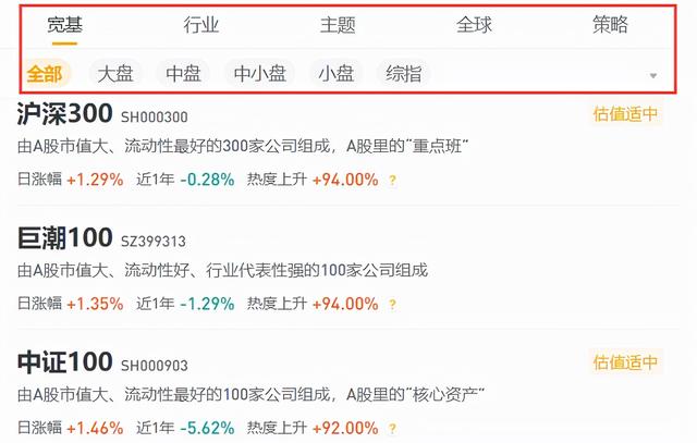 有【宽基】相关指数,比如大盘、中小盘、综指等