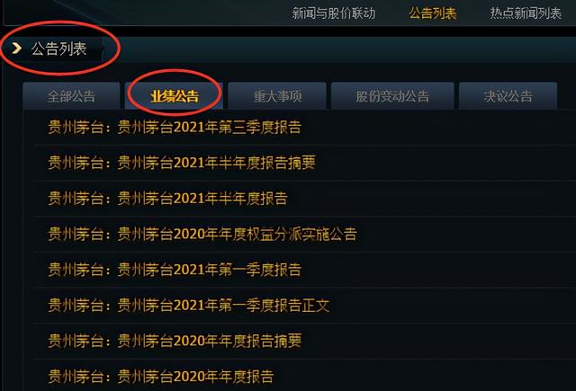 3)如果我们想查询公司的财务报表,就点击【新闻公告】一栏,在【公告列表】中,点击【业绩公告】然后就可以查询任意一期的财务报告