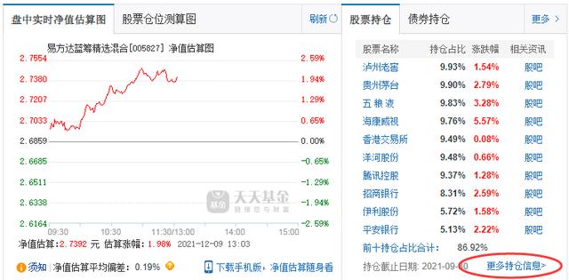 可以查看该基金的实时净值图和股票前十大持仓情况