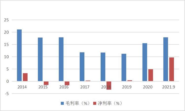 与加权净资产收益率呼应的是毛利率和净利率,在图中获取的信息是在2020年之前,长电科技的净利率和毛利率逐年下跌,状况不容乐观。在2020年情况大为改善,2021年前三个季度更是节节攀升。