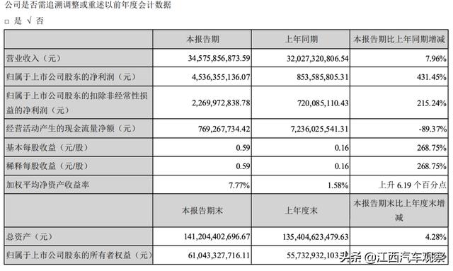 与此同时,长安汽车发布2022年一季度财报。报告显示,一季度长安汽车实现营业收入345.76亿元,同比增长7.96%。实现归母净利润为45.36亿元,同比增长431.45%;实现归母扣非净利润为22.69亿元,同比增长215.24%。