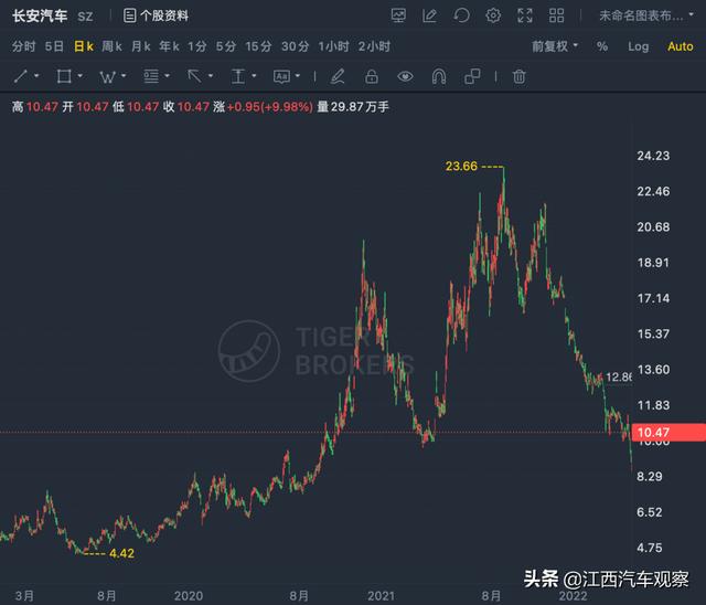 不管是年报还是季度报,长安汽车的表现还是十分强劲的,叠加市场消息面刺激以及近段时间股市持续回调后的反弹需求,长安汽车在近一个交易日涨停,当前股价为10.47元,总市值为799亿元。