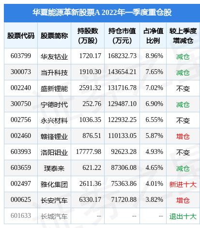 根据2022Q1季报基金重仓股数据,重仓该股的基金共10家,其中持有数量最多的基金为华夏能源革新股票A。华夏能源革新股票A目前规模为184.34亿元,最新净值2.779(4月28日),较上一交易日上涨0.87%,近一年上涨3.19%。该基金现任基金经理为郑泽鸿。郑泽鸿在任的公募基金包括:华夏核心制造混合A,管理时间为2021年6月22日至今,期间收益率为-22.26%;华夏成长先锋一年持有混合A,管理时间为2021年11月16日至今,期间收益率为-22.46%。