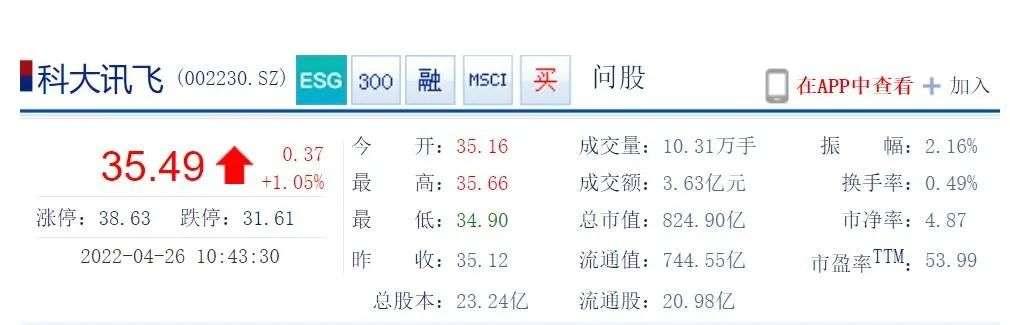 然而,由于从月初至今,科大讯飞的股价坐了一轮“过山车”,截止4月24日收盘,科大讯飞股价报收38.4元,与这段时间最高峰的超过51元股价相比,跌幅超过20%。4月26日开盘,科大讯飞股价略涨1.05%达到35.49元,总市值为824.90亿元。