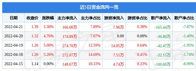 资金流向数据方面,上个交易日主力资金净流入166.0万元,游资资金净流入7.96万元,散户资金净流出165.44万元。近5日资金流向一览见下表: