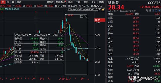 Wind数据显示,9月2日,新希望股价盘中冲高至42.20元,但之后股价一路走低,截至9月24日收盘,17个交易日内新希望股价累计已跌近30%。(中新经纬APP)