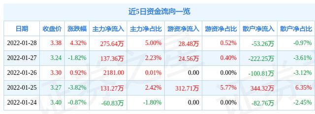资金流向数据方面,上个交易日主力资金净流入275.64万元,游资资金净流入28.48万元,散户资金净流出53.26万元。近5日资金流向一览见下表: