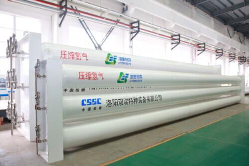 中国船舶双瑞特装氢气储运装备,包括氢气管束集装箱和加氢站用储氢瓶式容器。前者用于将高压氢气转运至加氢站,后者用于为站用加氢机提供高压氢气。依托在材料工艺研究和金属加工领域的技术优势,利用军用高压气瓶的研制技术,突破高精度旋压成型、洁净内表面处理、大容积气瓶安全评价技术,解决了大容量氢气储运与小分子气体密封问题。上图为氢气管束集装箱,下图为站用储氢瓶式容器。