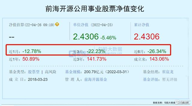 以第一季度为例,崔神的王牌–前海开源公用事业股票净值下跌21.65%,前海开源新经济混合A净值下跌15.35%,遭遇开门黑。截止4月25日,近1个月、3个月、6个月的净值,都处于下跌状态,虽然拉长时间看,以年为单位,基金的净值仍然是上涨的。
