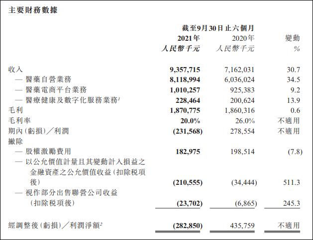 报告期内,阿里健康亏损2.32亿元,经调整后的亏损净额约为2.83亿元,这两项指标同比由盈转亏。