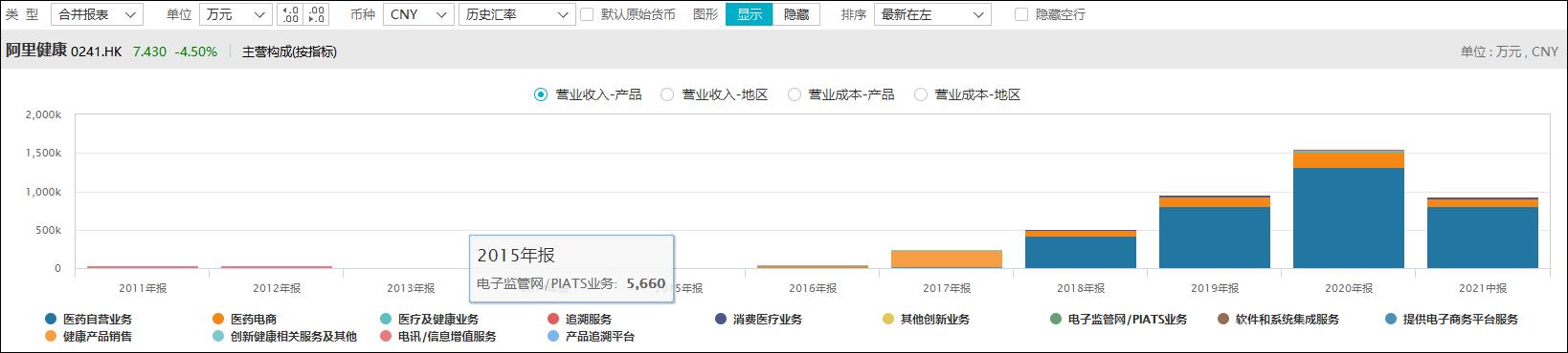 阿里健康营收构成中,基于中信21世纪原有业务的部分占比较小(2011年报-2021中报)