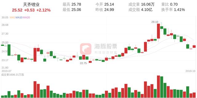 本文摘要:天齐锂业今日上涨2.12%,股价为25.52元,成交金额为4.10亿元,成交16万手,换手率为1.41%。海豚股票APP操盘线走势解析:走势处于下降趋势中,短期走势弱于大盘。主力资金方面:当日净流入4786万,近三日净流入-1.18亿。公司… …