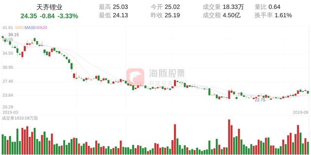天齐锂业今日下跌3.33%,股价为24.35元,成交金额为4.50亿元,成交18万手,换手率为1.61%。