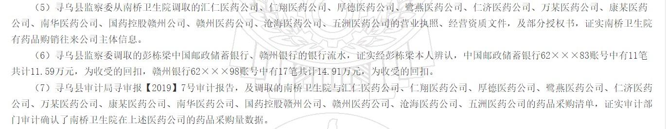寻乌县审计局寻审报【2019】7号审计报告,及调取的南桥卫生院与汇仁医药公司、仁翔医药公司、厚德医药公司、鹭燕医药公司、仁济医药公司、万某医药公司、康某医药公司、南华医药公司、国药控股赣州公司、赣州医药公司、沧海医药公司、五洲医药公司的药品采购清单,证实审计部门审计确认了南桥卫生院在上述医药公司的药品采购量数据。