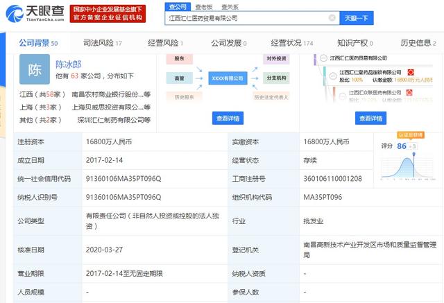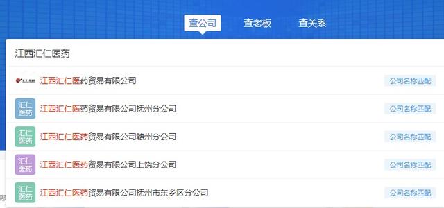 另外还有江西汇仁医药、江西仁翔医药、江西南华医药等多家医药公司。其中在天眼查中搜索江西汇仁医药字眼,搜索显示主体为江西汇仁医药贸易有限公司,其中还有各地分公司。