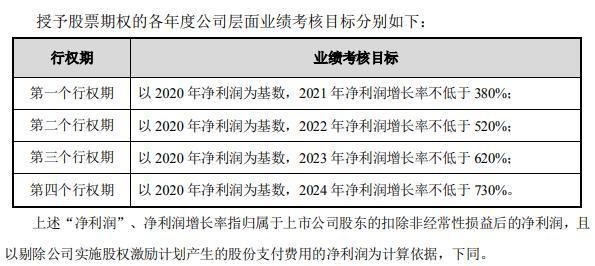 第一个行权期以2020年净利润为基数,2021年净利润增长率不低于380%,其中净利润增长率指归属于上市公司股东的扣除非经常性损益后的净利润。