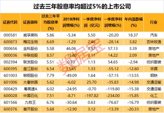 按照过去三年股息率均值来看(以当年末收盘价计算),平均股息率位居前三的分别为华联控股(000036)、柳钢股份(601003)及中国石化,均超过了7.5%。值得一提的是,华联控股和柳钢股份2019年净利润均呈现了不同程度的下滑,但股息率仍然保持较高水平,可见上市公司比较重视投资的利益。另外,盘江股份(600395)、梅花生物(600873)等4股过去三年平均股息率均超过了6%。